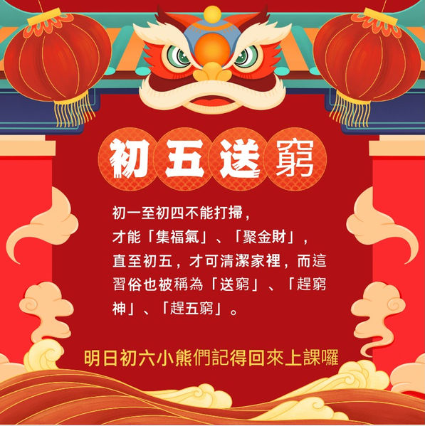 初一至初四不能打掃,才能「集福氣」、「聚金財」,直至初五,才可清潔家裡,而這習俗也被稱為「送窮」、「趕窮神」、「趕五窮」。也是大家的開工日但#元氣小熊初六開工喔#也就是明日要上班上課嚕~#明日初六小熊們記得回來上課囉#明日初六小熊們記得回來上課囉#明日初六小熊們記得回來上課囉
